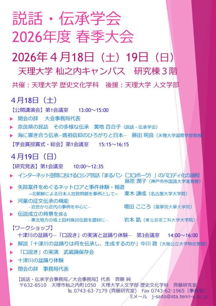 今年度大会・例会案内 説話・伝承学会 2026年度春季大会 2026年4月18日(土)・19日(日) 会場:天理大学 杣之内キャンパス 研究棟 3階 第1・第3会議室 共催:天理大学 歴史文化学科 後援:天理大学 人文学部 2026年度説話・伝承学会春季大会プログラム詳細